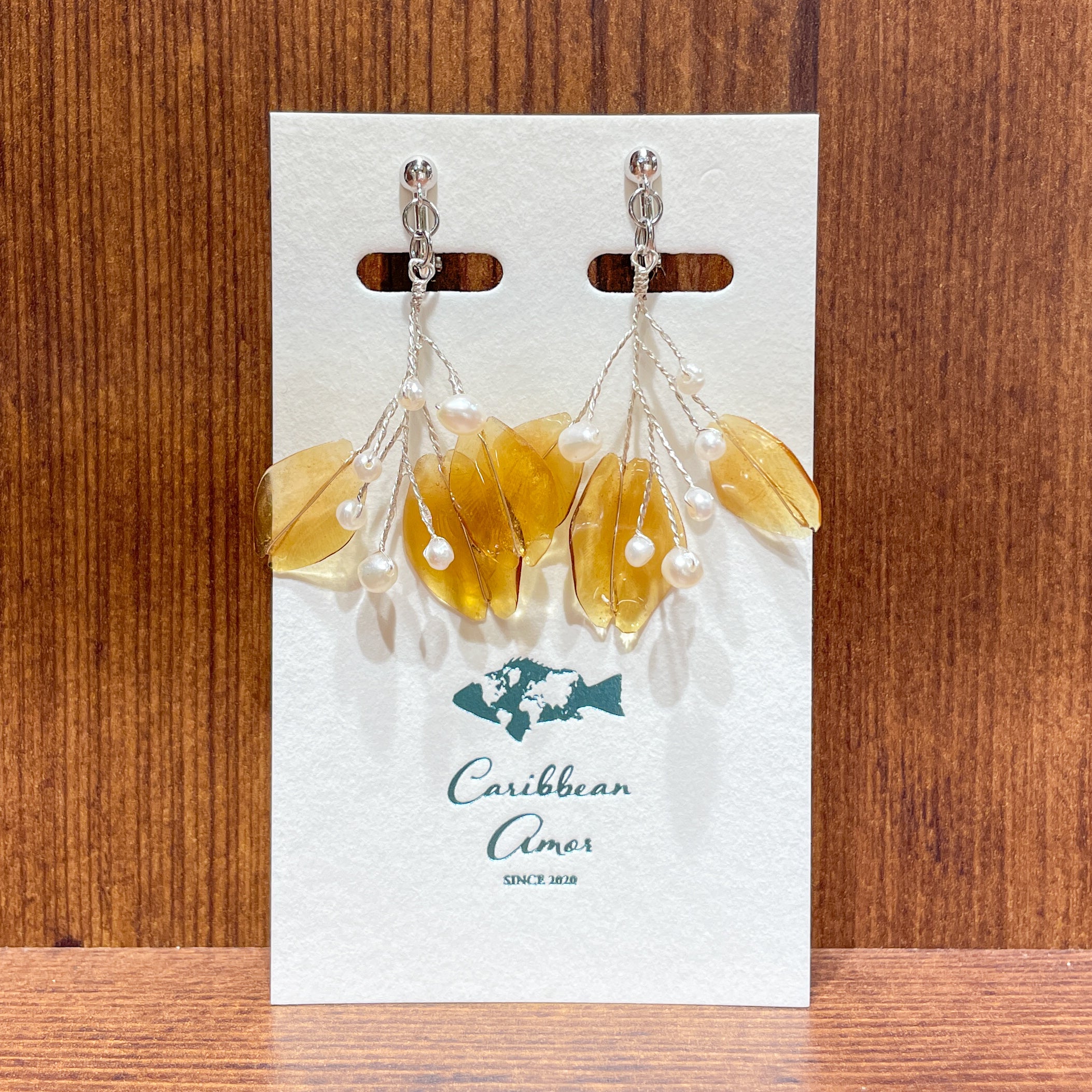 手作りの魚の鱗イヤリング。透明感のある茶色の鱗と淡水パールの組み合わせた一品。透け感のある鱗が日の光にあたりキラキラと輝きます。]